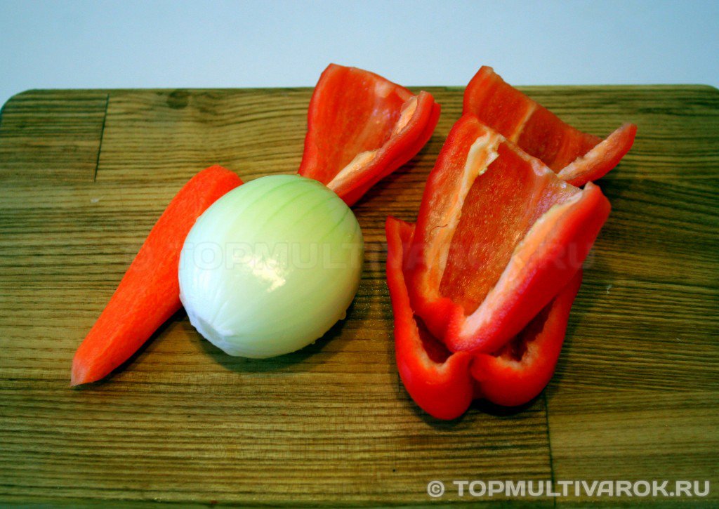 Положить в чашу мультиварки лук, перец и морковь и жарить с открытой крышкой примерно 15 минут периодически перемешивая.