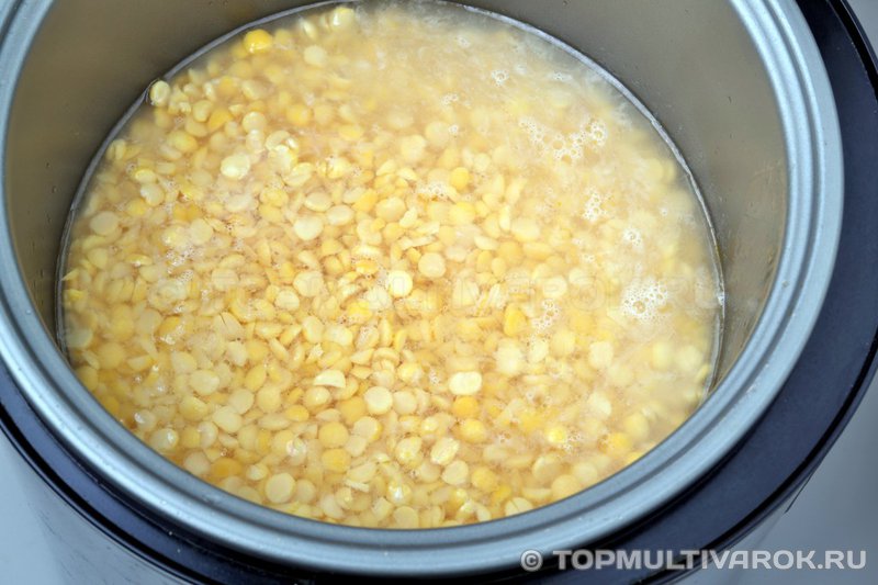 В чашу мультиварки насыпать горох, залить тремя литрами. воды, закрыть крышку мультиварки, выбрать режим «Суп» (~100°C), установить время приготовления 70 минут.