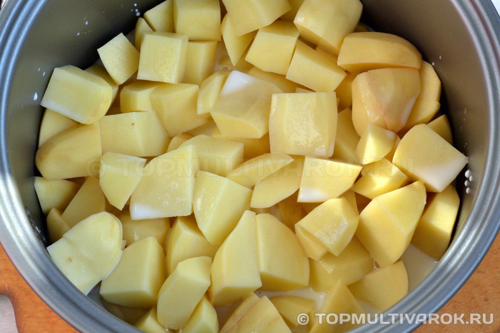 Выберите режим "Тушение", установите время приготовления 1 час. Добавьте в чашу мультиварки растительное масло и сразу же положите нашинкованные лук и морковь. Добавьте картошку. Вылейте горячее молоко, перемешайте все ингредиенты, и оставьте тушиться на 30 мин.