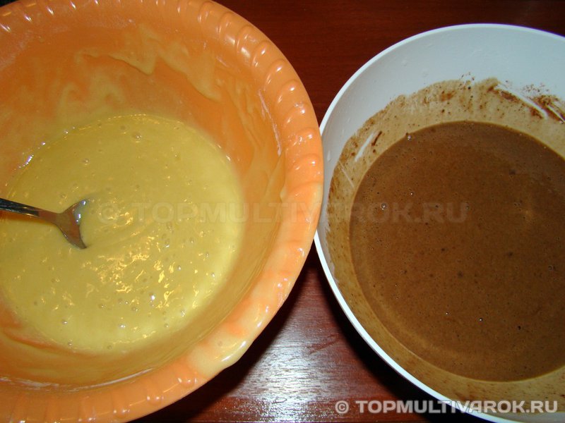 Затем разделить тесто на две равные части. В одну часть теста добавить корицу, какао и кофе, перемешать.