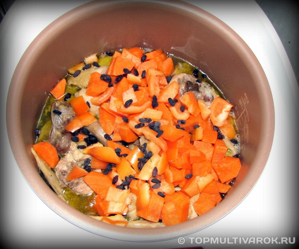 Отправляем к мясу в чашу мультиварки, так же поступаем со сладким болгарским перцем. Солим, перчим и посыпаем мясо щепоткой барбариса – он придаст особенный аромат и кислинку.