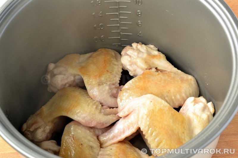 Выбрать программу "Жарка" ("Суп/Пароварка" для Moulinex MK 700330). Обжарить крылышки с двух сторон до румяной корочки.