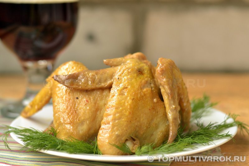 Залить куриные крылышки 200 миллилитрами темного пива. Сменить программу мультиварки на "Тушение". Установить время приготовления 70 минут.