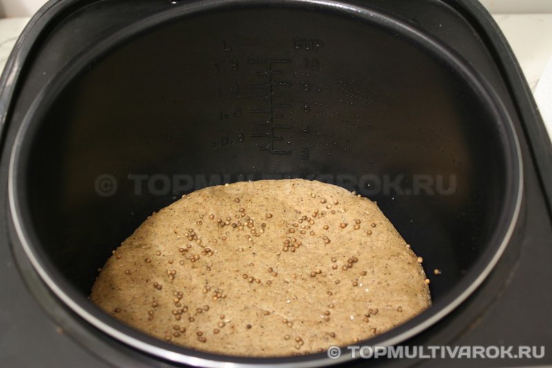 Чашу мультиварки смазать оливковым или подсолнечным маслом. Переложить тесто в чашу. Руками разровнять его по дну так, чтобы оно полностью заполнило чашу мультиварки.