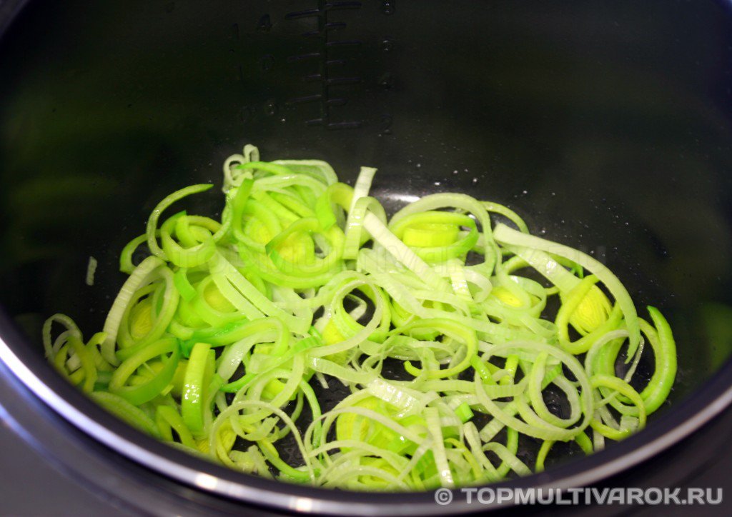 Чашу мультиварки вымыть. Влить в неё немного растительного масла. Включить программу «Жарка» (температура 145°С) или «Выпечка» (температура 140°С). Обжарить лук в течение 5 минут.