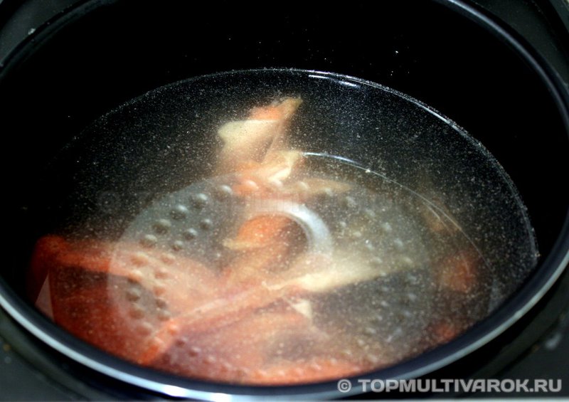 В чашу мультиварки сложить хребет горбуши. Залить водой. Выставить режим «Рыба» (температура приготовления 115°С) на 1 час. Если такой программы нет, то подойдет программа «Варка» или «Суп». Готовить с закрытой крышкой.