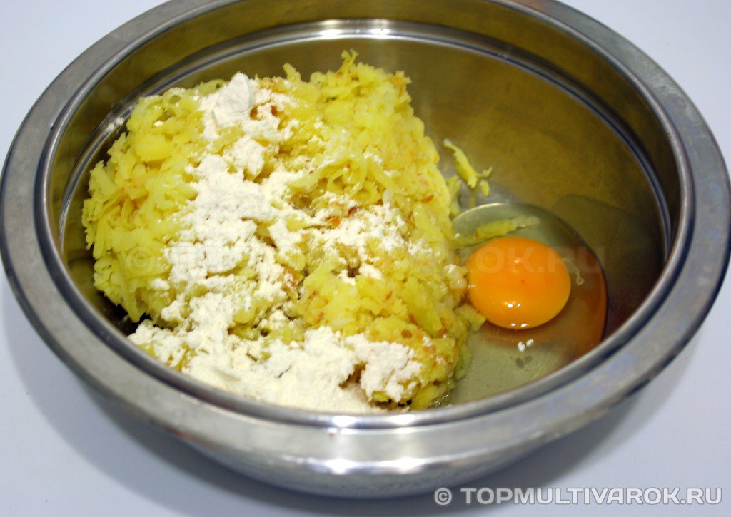 Замесить густое картофельное тесто. Раскатать его в «колбаску» и разрезать ножом. Каждую клёцку слегка примять вилкой. Сложить клецки на тарелку посыпанную мукой и поставить в морозильную камеру примерно на 30 минут.