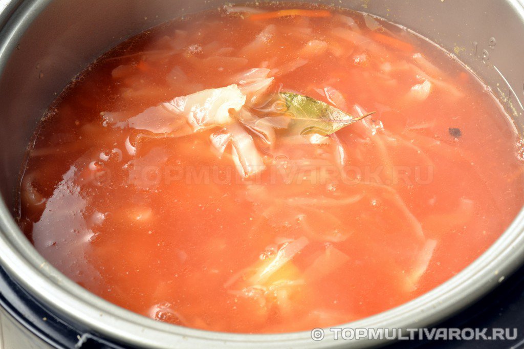 Через 35 минут после старта программы в чашу мультиварки добавить лавровый лист, перец горошком, соль.
