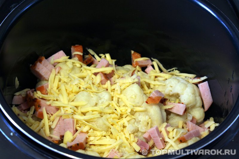 Подробный пошаговый фото-рецепт запеканки с цветной капустой, ветчиной и шпинатом на хлебной подушке в мультиварке.