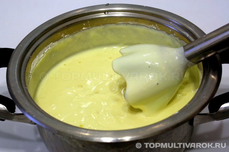 Приготовить творожную начинку. Творог, сметану, яйца, сахар и ванилин взбить блендером. В несколько приемов добавить крахмал и взбить до состояния однородности.